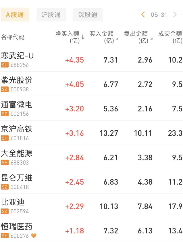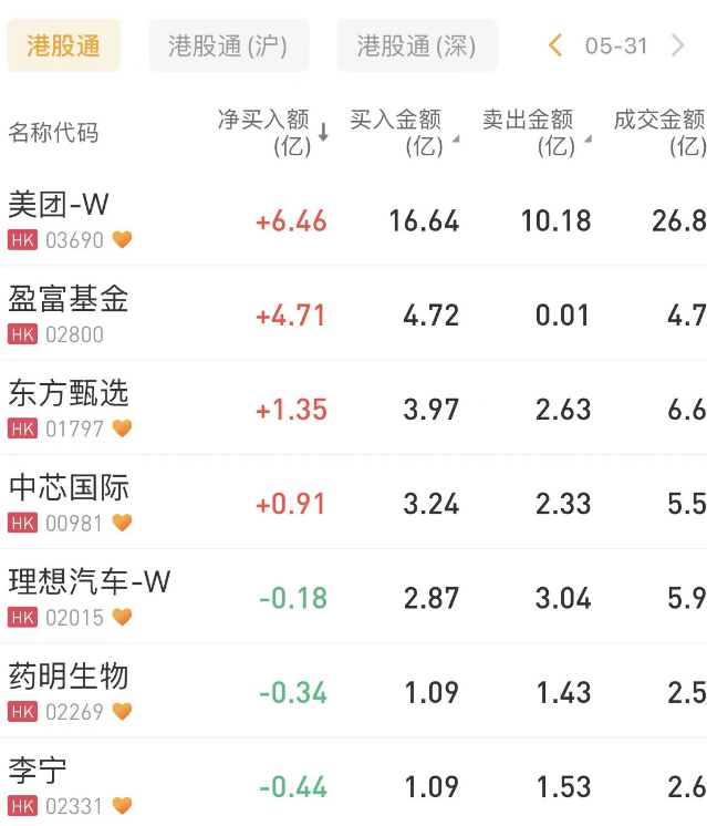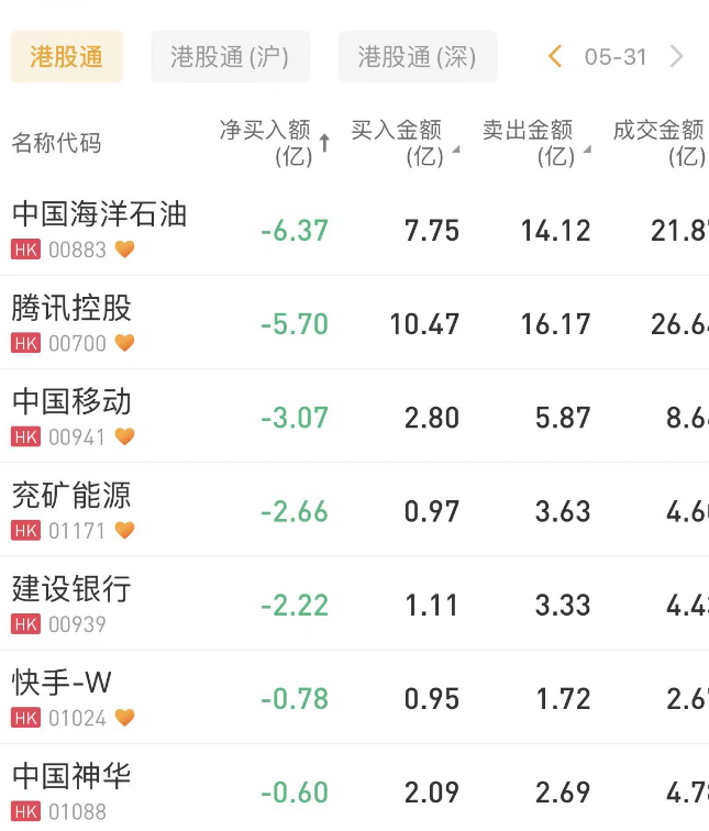 华盛资讯5月31日讯, 南向资金今日净卖出3.87亿港元,其中港股通(沪)净买入2502.87万港元,港股通(深)净卖出4.12亿港元。北向资金全天净卖出41.67亿元。