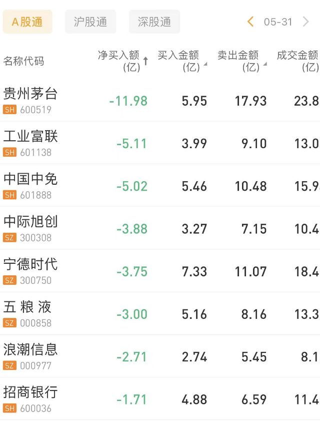 北向资金减仓贵州茅台