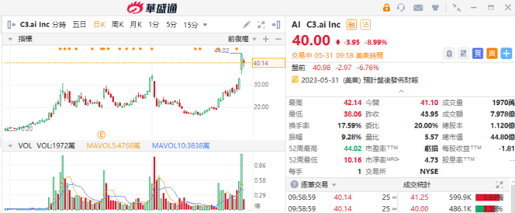 C3.ai昨日暴涨超33%,公司周二宣布其生成式AI在亚马逊旗下AWS Marketplace上架。此外,公司还将与近日美股盘后发布业绩,当前不断上涨的股价已提前反映出投资者对于该公司业绩以及发展前景的极度乐观预期。