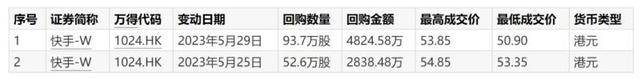 5月以来,快手-W分别在25日和29日,共计耗资7663万港元回购了156万股。