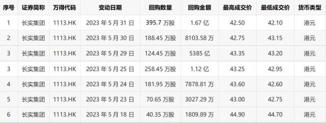 李嘉诚旗下的长实集团公布,2023年5月31日耗资约1.67亿港元回购395.7万股股份。