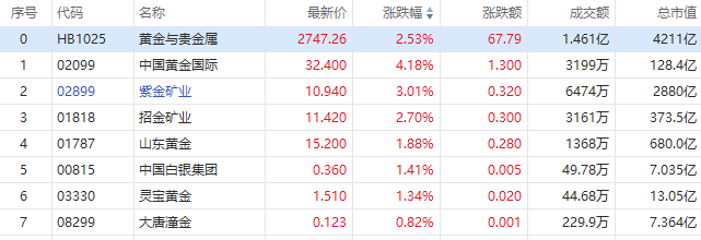 华盛资讯5月31日消息,黄金股早盘集体走高,截至发稿,中国黄金国际( $02099.HK )涨4.18%报32.4港元每股,紫金矿业( $02899.HK )涨超3%,招金矿业( $01818.HK )涨2.7%;山东黄金( $01787.HK )、灵宝黄金( $03330.HK )涨超1%,大唐潼金跟涨。