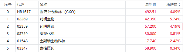 6月1日消息,CXO概念股午后普涨,截至发稿,药明生物 $02269.HK 涨超5%;药明康德 $02359.HK 涨超4%;康龙化成 $03759.HK 涨超3%;金斯瑞生物科技 $01548.HK 涨超2%;泰格医药 $03347.HK 跟涨。