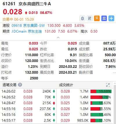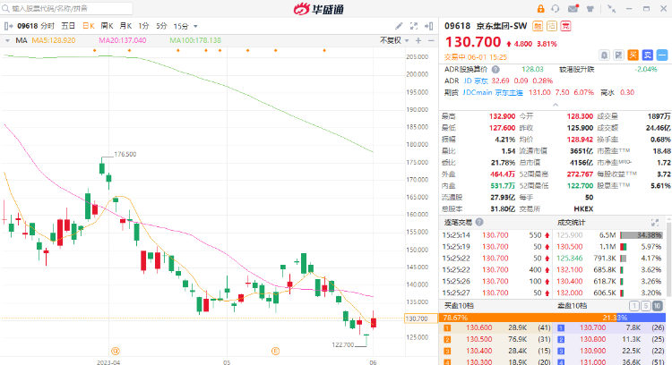 正股表现:京东( $09618.HK )今年的618购物节开始,10分钟销售额破亿元,品牌数量按年增加23%。京东股价今早向好,盘中升超5%,稿件132.9港元每股。