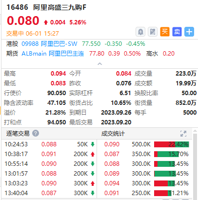 产品选择:投资者如看好阿里,行使价90港元附近、9月份到期的阿里购是今早最活跃条款之一,属中期轻微价外,条款合适,当中可留意购 $16486.HK ,是低街货的选择;贴价证可留意购 $26143.HK ,对冲值较高。看淡阿里可留意中期轻微价外沽 $11183.HK ,是7只相近条款产品最高杠杆。
