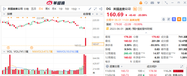 美国达乐公司(DG.US)大跌20%,报160.69美元,总市值351亿美元。美国折扣连锁店达乐公司下调了全年同店销售额和利润预期,原因是受持续通胀的影响,从家庭用品到消耗品等各种商品价格上涨,使消费者收紧非必要支出。