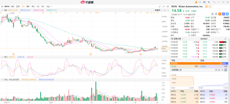 Rivian Automotive周四收跌1.02%,报14.58美元。该股至今下跌了20%,相比之下,另一家电动车初创公司Lucid Group(LCID.US)下跌5.4%;与此同时,行业领导者特斯拉(TSLA.US)上涨了68%。
