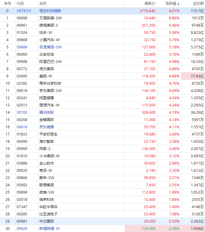 科技股多数走高,万国数据-SW涨超8%,携程集团-S涨超6%,快手-W、众安在线、百度集团-SW涨超5%,阿里巴巴-SW、阅文集团、京东集团-SW、美团-W、腾讯控股涨超4%;哔哩哔哩-SW绩后跌超2%。