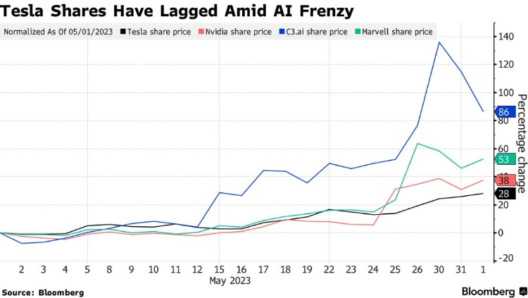 据了解,由于投资者在过去几周里追捧任何与生成式人工智能相关的东西,一些科技股推动了特斯拉股价的上涨。虽然该公司的股价得到了温和提振,但与英伟达(NVDA.US)、C3.ai(AI.US)或迈威尔科技(MRVL.US)的涨幅相比,该公司的股价涨幅要小得多。