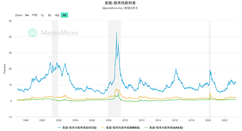 驱动美国信用市场在近期恶化的原因不止有美债违约的风险,目前美国经济衰退的风险还很高,信用市场似乎也在提前反映这一预期。从美国信用风险利差的走势可以看到,美国垃圾债的信用利差在近期明显走阔。