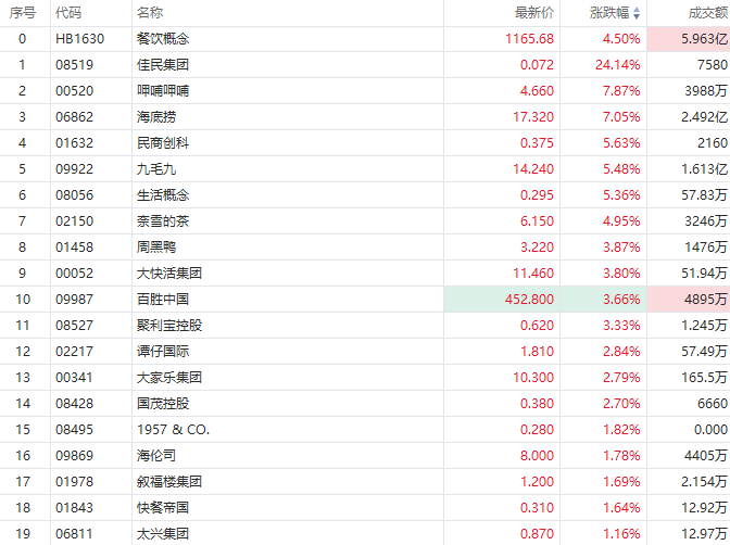 6月2日,海底捞走高涨超7%,带动餐饮概念走高,呷脯呷脯涨超7%,九毛九涨超5%,奈雪的茶涨超4%,百胜中国涨超3%,海伦司涨超1%。