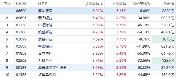 截至发稿,海尔智家A股涨6.01%,H股现涨5.15%;天齐锂业A股涨5.49%,H股现涨8.27%;中远海能A股涨5.06%,H股现涨7.79%。