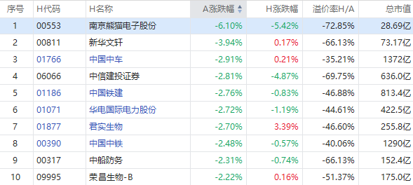 南京熊猫电子股份A股跌6.1%,H股现跌5.42%;中国中车A股跌2.91%,H股现涨0.21%;君实生物A股跌2.7%,H股现涨3.39%。