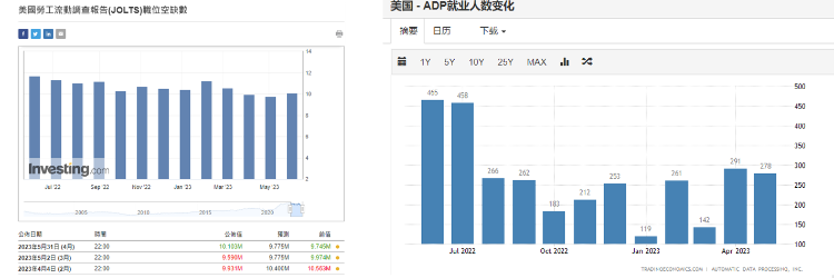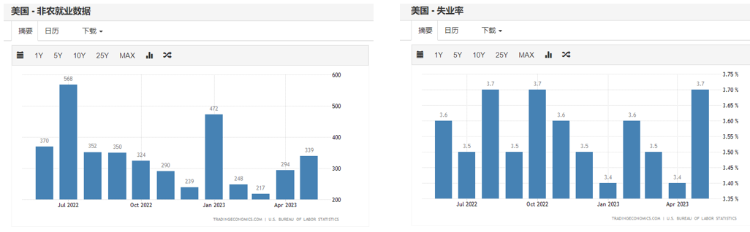 美国公布4月份JOLTS职位空缺增加至1,010.30万个,远高过预期977.5万个,及上月974.5万个。并创近3个月新高。俗称「小非农」的ADP就业人数在5月份新增27.8万个,远胜预期17万个,唯仍小于上月经修订后的29.6万个。劳工部公布5月份非农就业新增职位33.9万个,远多过预期19.5万个及上月25.3万个。同月份失业率意外升至3.7%,同高过预期3.5%及上月3.4%。数据反映劳工市场持续紧张的情况并无改变。