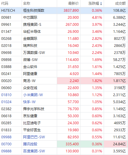 科网股方面,中芯国际涨超4%,携程集团、华虹半导体涨超3%,金蝶国际、瑞声科技、万国数据涨超2%,微博、金山软件、阿里健康、商汤、小米、快手涨超1%,阿里巴巴、腾讯小幅上涨。