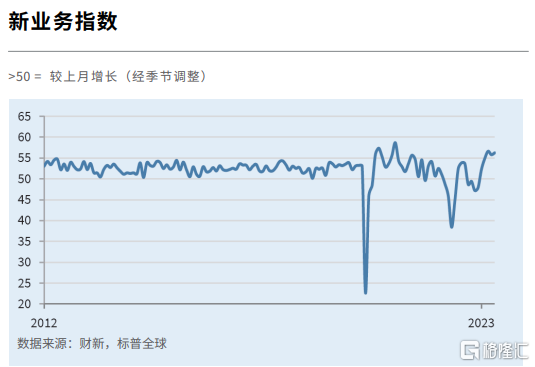 与经营活动一样,中国服务业新接业务总量在 5 月份也录得更加强劲增长,增速同样创下 2020 年 11 月后次高记录。据调查样本企业反映,自取消防疫限制后,需求持续改善,顾客数量不断增加。