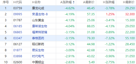 康龙化成A股跌超4%,H股现跌超3%;荣昌生物-BA股跌超4%,H股现涨1.25%;山东黄金A股跌超4%,H股现跌超3%。