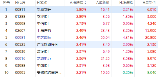 截至发稿,新华文轩A股涨5.8%,H股现涨2.21%;农业银行A股涨2.89%,H股现涨1.35%;中芯国际A股涨2.46%,H股现涨超4%。