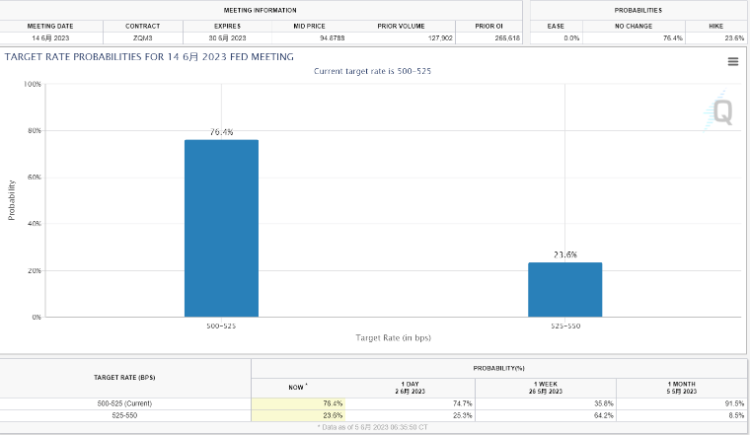 CME“美联储观察”:美联储6月维持利率不变的概率为76.4%,加息25个基点的概率为23.6%;到7月维持利率在当前水平的概率为32.1%,累计加息25个基点的概率为55.6%,累计加息50个基点的概率为12.3%。