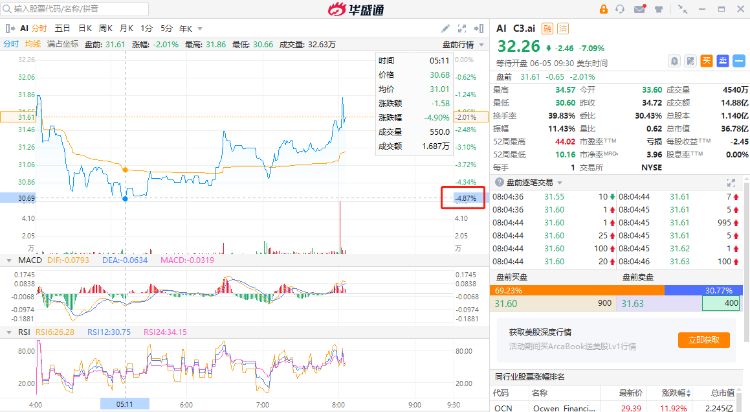 C3.ai今日美股盘前一度跌近5%,现跌2.01%,报31.61美元。公司预计2024财年营收2.95-3.2亿美元,其中值低于预期的3.17亿美元。此外,根据SEC文件,C3.ai董事于5月30日以每股平均价42.09美元售出12万股普通股股份,价值约为505.08万美元。