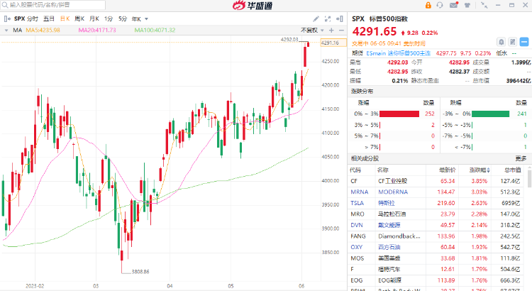 周一,美股基本平开。上周五,美股大涨,标普500指数收盘创2022年8月18日以来最高水平。如果收盘价高于4292.48,则标志着从2022年10月12日创下的低点3577.03反弹20%,走出自1948年以来持续时间最长的熊市行情。