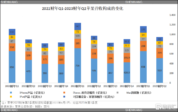 2023财年第二季度,除iPhone收入同比增长2%外,Mac、iPad、可穿戴设备等给苹果带来的收入都处于下滑状态,同比增速分别为-31%、-13%、-1%、