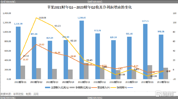 据财报显示,2023财年Q1至Q2,苹果营收同比增速分别为-5.48%及-2.51%;净利润同比增速分别为-13.38%及-3.4%。