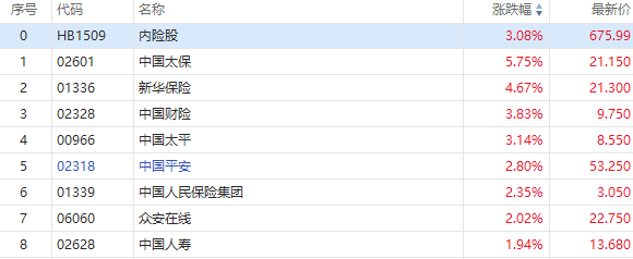港股内险股早盘回暖,截至发稿,中国太保(02601)涨5.75%,报21.15港元;新华保险(01336)涨4.67%,报21.23港元;中国财险(02328)涨3.83%,报9.75港元;中国太平(00966)涨3.14%,报8.55港元;中国平安涨2.8%,报53.25港元。