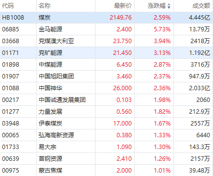 华盛资讯6月6日消息,港股煤炭股早盘走高。截至发稿,金马能源涨超5%,兖煤澳大利亚、兖矿能源涨超3%,中煤能源、中国旭阳集团、中国神华涨超2%,伊泰煤炭、首钢资讯、蒙古焦煤涨超1%。