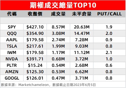 3、苹果昨日盘中刷新新高,随后转跌。苹果期权成交量较上一日激增92%。消息面上,经历了七年的研发之后,苹果周一在加州的全球开发者大会上推出一款名为Apple Vision Pro的混合现实(MR)头戴式设备。该头戴式设备定价为3499美元,高于大多数竞争对手,计划2024年初上市。