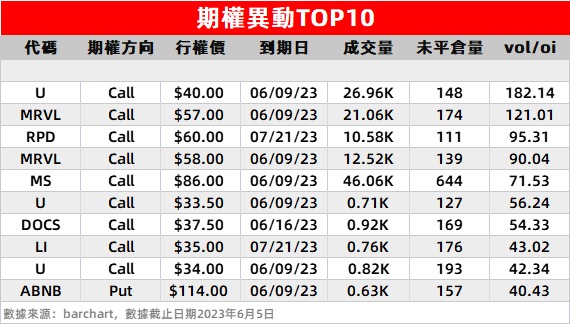 4、爱彼迎隔夜收跌超2%。其在本周五到期、行权价在114美元的看跌期权受到资金关注,这也是本次榜单唯一看跌期权上榜。消息面上,公司董事Gebbia Joseph于5月31日以每股平均价105.8331美元售出35万股普通股股份,价值约为3,704.16万美元。 此外,Truist 分析师 Patrick Scholes将爱彼迎的目标价从130美元下调至116美元,并维持“持有”评级。