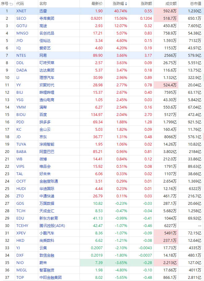 盘前上,迅雷涨40%,董事会批准2000万美元股票回购计划;寺库集团涨15%;高途涨超12%,佳裕达涨4.6%。中概科网股普涨,网易涨3.66%,哔哩哔哩、百度涨超2%,拼多多涨1.88%,金山云、京东升逾1%,阿里巴巴微涨0.96%。