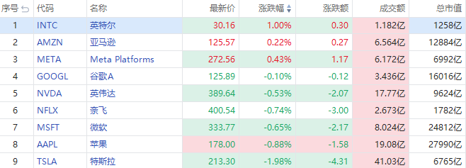 明星科技股涨跌互现,英特尔涨1%,亚马逊、Meta跟涨;特斯拉跌近2%报213.3美元每股,成交额41.03亿美元,苹果跌0.88%,MR头显价格超预期,微软、奈飞、英伟达跟跌。