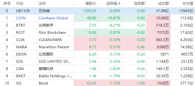 盘面上,Coinbase盘中跌近17%领跌美股区块链概念股,现报48.8美元每股,成交额10.68亿美元;比特数字跌超8%,Riot Blockchain跌5.81%,嘉楠科技、比特矿业、Block跟跌。