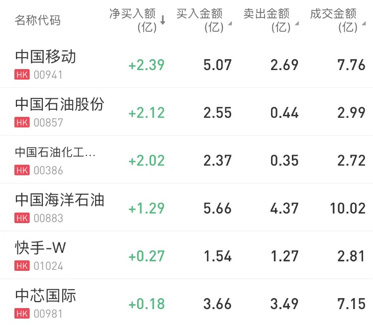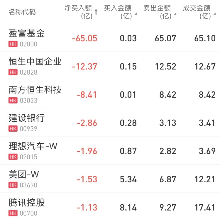 盈富基金、恒生中国企业、南方恒生科技分别遭南下资金净卖出65.05亿港元、12.37亿港元、8.41亿港元;中国移动逆势获净买入2.39亿港元。