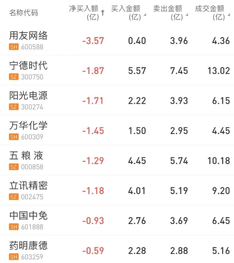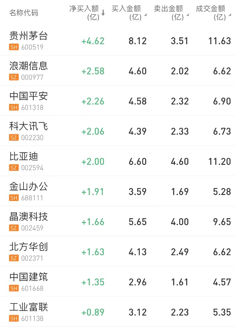 北向资金净流入10.14亿元,沪股通净流入15.90亿元,深股通净流出5.76亿元。用友网络、宁德时代、阳光电源分别获净卖出3.57亿元、1.87亿元、1.71亿元。贵州茅台净买入额居首,金额为4.62亿元。