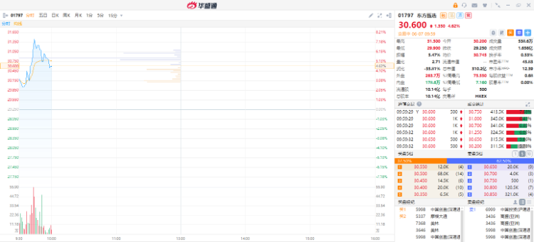 华盛资讯6月7日消息,东方甄选盘中一度高涨超6%,截至发稿,涨4.6%,报30.6港元,成交额1.65亿港元。