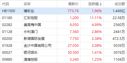 华盛资讯6月7日消息,港股博彩股走高。截至发稿,美高梅中国涨超5%,永利澳门、新濠国际发展、金沙中国涨超2%,银河娱乐、澳博控股涨超1%。