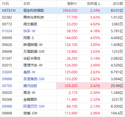 科网股方面,舜宇光学科技涨超5%,阅文集团、快手、网易涨超4%,哔哩哔哩、华虹半导体涨超3%,理想汽车、美团、百度、腾讯、商汤、阿里巴巴、微博涨超2%。