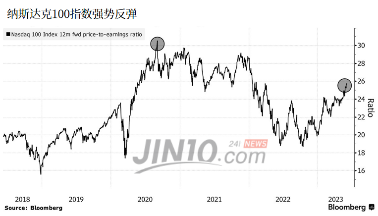 纳斯达克100指数自12月以来的反弹,已将该指数的12个月远期市盈率提升至25.7倍,高于过去十年的平均20.7倍,但低于2020年的30.5倍。