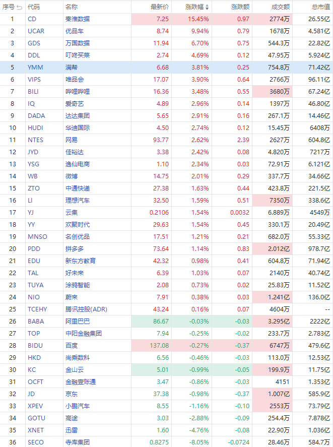 此外,寺库集团跌超8%,该股昨日收涨超12%;迅雷跌超4%,高途跌2.88%,小鹏汽车跌超1%,金山云、京东跌近1%,百度、阿里巴巴跟跌。