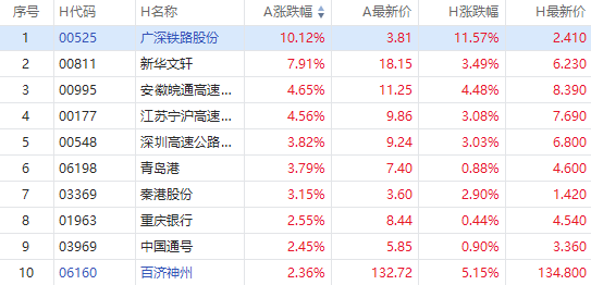 截至发稿,广深铁路股份A股涨停,H股现涨超11%;新华文轩A股涨超7%,H股现涨超3%;深圳高速公路股份A股涨超3%,H股现涨3%。