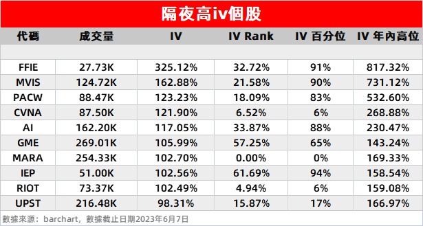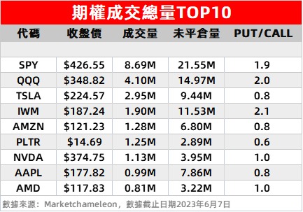 5、美国超微公司收跌5.15%,成交98.6亿美元。期权成交总量小幅上升至81万张。消息面上,根据官方披露,AMD将在6月13日举行发布会,届时正式发布最新款处理器MI300,该款处理器也被众多分析师看作是对标英伟达GH200的旗舰产品。