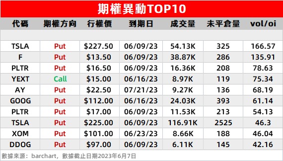 3、Palantir收跌超4%,五日累涨近100%。其本周五到期、行权价在16.5和17美元看跌期权获得资金热捧。消息面上,根据美国证券交易委员会(SEC)6月7日披露的文件,公司董事Karp Alexander C.于6月5日以每股平均价15.4015美元售出32.5万股普通股股份,价值约为500.55万美元。