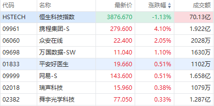 部分科网股逆市上涨,携程集团涨超4%,众安在线涨超2%,平安好医生、网易、瑞声科技小幅上涨。