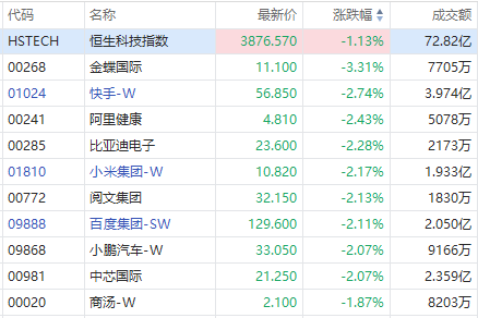 其它个股方面,金蝶国际跌超3%,快手、阿里健康、比亚迪电子、小米、百度、中芯国际跌超2%。