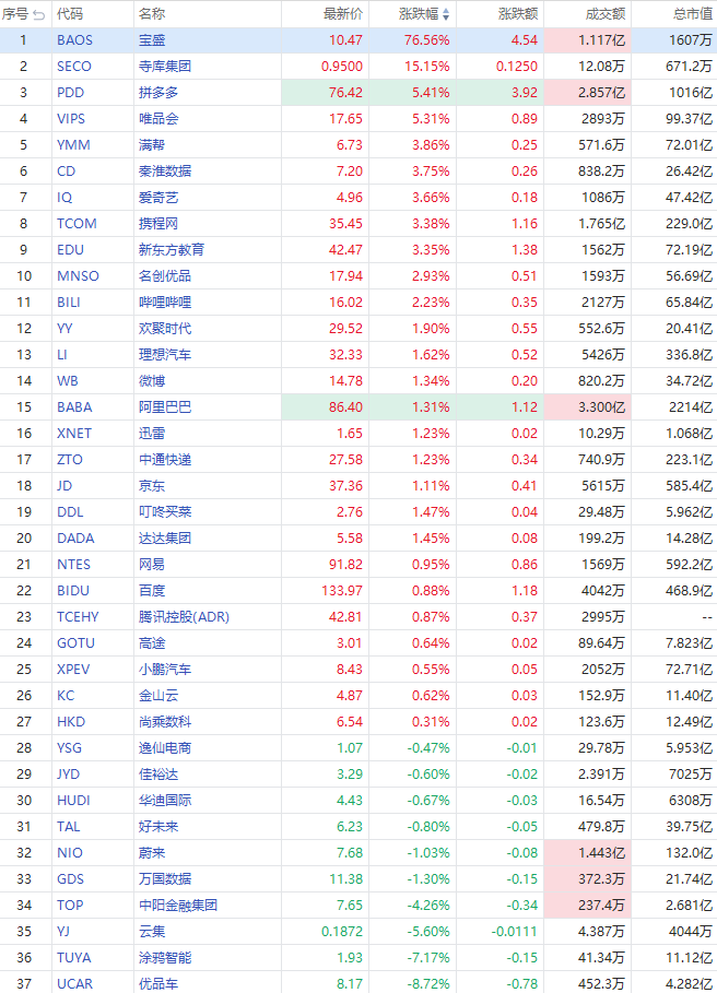 盘前上,宝盛放量大涨,盘中一度涨逾103%,现涨76.56%报10.47美元每股,成交额1.12亿美元。寺库集团涨15.15%,拼多多涨5.41报76.42美元每股,爱奇艺、新东方教育涨超3%。携程网绩后涨超3%,公司Q1净营业收入同比上升124%。