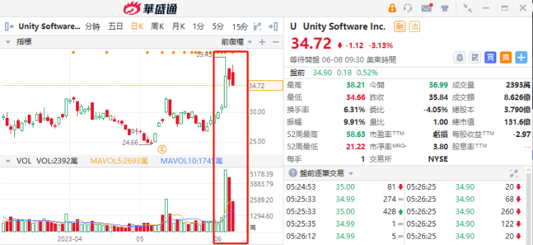 虽然苹果股价单日下挫,但在这个产品发布之后,Unity Software $U g股价却上涨了17%以上,达到了36.32美元。根据彭博社的报道,这是该股票自2020年上市以来第三大涨幅。根据技术分析,它已经突破了32美元的关键位,Loui预计这种势头可能会持续到43-45美元区间,较当前价还有近30%升幅空间。