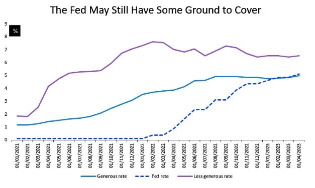 上图展示了美联储的基准利率(蓝色虚线),以及泰勒规则宽松(Generous,蓝色实线)和严格(Less generous,紫色实线)应用下显示的利率应有水平。