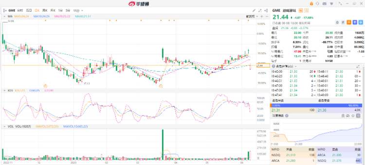 游戏驿站$GME大跌17.89%,报21.44美元,总市值65.39亿美元。游戏驿站第一季度营收12.4亿美元,低于预期的13.4亿美元;调整后每股亏损0.14美元,胜预期的亏损0.17美元。公司突发性宣布解雇了现任首席执行官Matthew Furlong,并取消了电话会议。